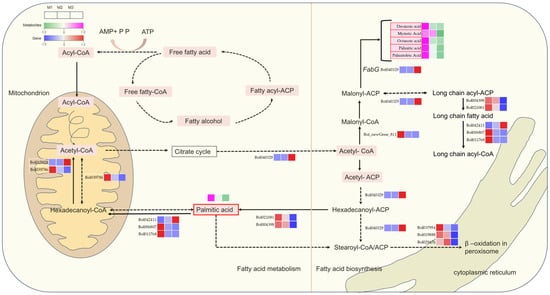 Lipid biosynthesis and metabolism play a crucial role in synthesizing the pollen wall, an essential process during male gametophyte development []. To investigate the involvement of lipid metabolic pathways in regulating male sterility, we constructed a detailed pathway map illustrating the key genes and differentially accumulated metabolites associated with fatty acid metabolism (Figure 6). Within plastids, fatty acids are synthesized by two enzyme systems: acetyl-CoA carboxylase and fatty acid synthase []. These enzymes catalyze the initial and elongation steps of fatty acid synthesis, respectively. Our analysis revealed that most differentially accumulated metabolites involved in fatty acid metabolism showed significant reductions during both the M2 and M3 stages. Notably, this reduction was more pronounced in the M3 stage, suggesting a stage-specific exacerbation of lipid metabolic disruptions.