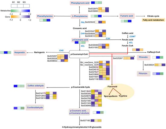 In the CMS metabolic pathway, the reduction in phenylpyruvic acid accumulation is even more pronounced compared with the DGMS line. However, the increased expression of Bol032870 and Bol035895 leads to the accumulation of L-phenylalanine metabolites in the DGMS line. Concurrently, the downregulation of PAL and 4CL, which are involved in cellulose biosynthesis, decreases p-coumaroyl-CoA. Both p-coumaroyl-CoA and ferulic-CoA are critical for flavonoid formation, thus affecting sporopollenin biosynthesis and suggesting that inhibited cellulose synthesis may be a significant factor in abnormal pollen wall structures. Furthermore, the accumulation of fumaric acid may exacerbate the sterility phenotype in CMS. In downstream pathways, the upregulation of Type III polyketide synthase A (Bol025267) in M3 accelerates the consumption of phoretin, while phoretin significantly accumulates in M2, resulting in metabolic differences in phlorizin between M2 and M3. These findings highlight key regulatory points in the phenylpropanoid pathway that influence male sterility in both DGMS and CMS systems.