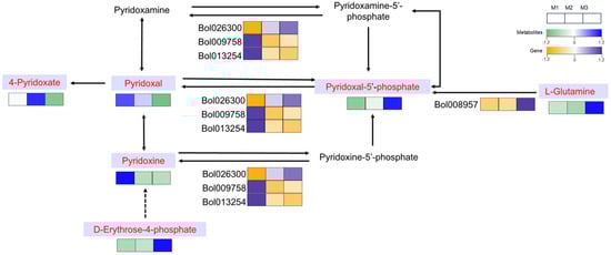 Vitamin B6 metabolic pathway. Purple boxes indicate differential metabolites.