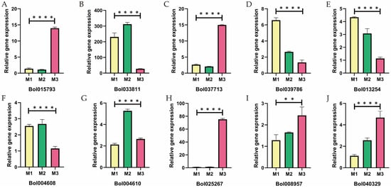 To further validate the DEGs identified in the transcriptome analysis, quantitative real-time PCR (qRT-PCR) experiments were conducted. Key genes associated with male sterility, including those involved in pollen development (Bol033811 and Bol01793), sugar metabolism (Bol037713), lipid synthesis (Bol040329 and Bol039786), phenylpropanoid metabolism (Bol004610, Bol004608, and Bol025267), and vitamin B6 metabolism (Bol008957 and Bol013254), were selected for analysis. The qRT-PCR experiments utilized the same RNA samples as the transcriptome data, and primers consistent with those used in the transcriptome analysis were employed to ensure data consistency and accuracy. The results showed that the majority of the qRT-PCR data aligned with the transcriptome findings, further confirming the significant role of DEGs in male sterility (Figure 9).