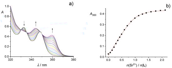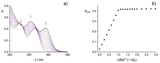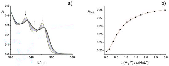 UV-absorption spectrometry. Spectrophotometric titrations were performed using UV-Vis spectrophotometers Agilent Cary 50 and Cary 60 (Santa Clara, CA, USA). The experiments were conducted in a way that the solution of L (V0 = 2.2 cm3, l = 1 cm) was titrated with the appropriate salt solution. The spectra were recorded with a step of 1 nm and an integration time of 0.2 s with baseline correction, at a constant temperature of (25.0 ± 0.1) °C. For titration of L with Mg2+, Ca2+, Sr2+, and Ba2+, the solutions of following concentrations were used: 1.0 × 10−4 to 1.6 × 10−4 mol dm−3 (L), 9.2 × 10−4 to 1.1 × 10−2 mol dm−3 (Mg(ClO4)2), 1.5 × 10−3 to 1.1 × 10−2 mol dm−3 (Ca(ClO4)2), 2.1 × 10−3 mol dm−3 (Ca(trf)2), 1.1 × 10−3 to 9.8 × 10−3 mol dm−3 (Sr(ClO4)2), 1.3 × 10−3 to 1.0 × 10−2 mol dm−3 (Ba(ClO4)2), and 2.1 × 10−3 mol dm−3 (Ba(trf)2). For competitive titrations in MeCN, solution of L (c = 1.0 × 10−4 to 1.1 × 10−4 mol dm−3) and sodium perchlorate (c = 1.0 × 10−4 to 1.1 × 10−4 mol dm−3) was titrated with the solutions of alkaline earth metal salts of the following concentrations: 4.23 × 10−3 mol dm−3 (Mg(ClO4)2), 1.6 × 10−3 mol dm−3 (Ca(ClO4)2), 1.5 × 10−3 mol dm−3 (Sr(ClO4)2), and 4.4 × 10−3 mol dm−3 (Ba(ClO4)2). The experiments were performed at least in triplicate. The obtained spectrophotometric data were processed using the HypSpec program (version 2.0.0.2) [68].