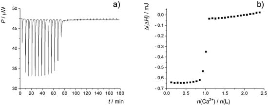 Experiments were conducted at a constant temperature of 25 °C by the addition of the alkaline earth metal salt solution to the solution of ligand L, or the solution containing NaL+ in competition experiments, by means of an automated burette (V = 300 μL). The measured enthalpy changes were corrected for titrant dilution heats. The experiments were carried out at least in triplicate. Thus, obtained microcalorimetric data were processed using Microcal OriginPro 7.0 and OriginPro 7.5 or in the case of competitive titrations using the HypDH program (version 1.1.0.28) [70].
