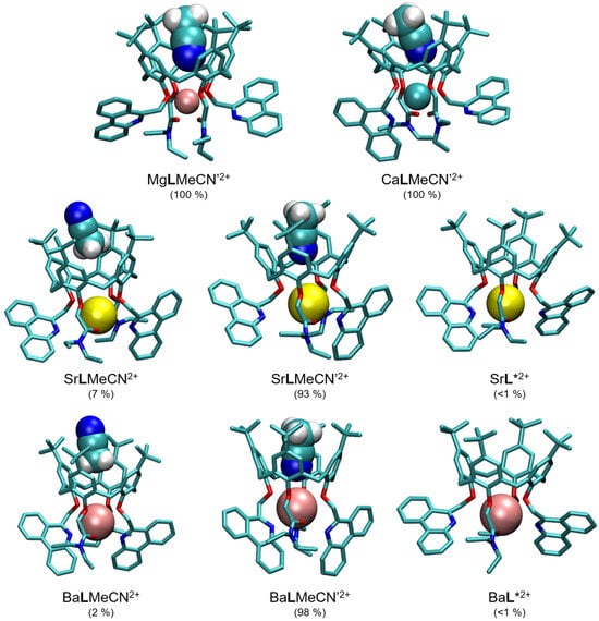 To explain the above findings, the impacts of calixarene binding site–cation interactions, cation and complex (de)solvation, as well as solvent inclusion in the calixarene cone need to be taken into account. Of course, ligand solvation also plays a part in the complexation process, but it is unnecessary to consider it when comparing the reactions in a single solvent. The contributions of electrostatic interactions between the cation and calixarene binding site are expected to be stronger for smaller cations of higher charge densities. On the other hand, for these cations, the desolvation taking place in the course of complexation is more energetically demanding than in the case of the larger ones. From the cation solvation point of view, the increase in reaction entropy with the cation size (Table 1) may seem unexpected, as for smaller cations the desolvation process is entropically more favorable. Thus, another process related to the solvent should play an important role, namely the exothermic but entropically unfavorable inclusion of the acetonitrile molecule in the calixarene basket [41,43,44,50,52,53,54,65]. Indeed, the occurrence of this process was proven experimentally (see Section 2.3), and this finding was supported by molecular dynamics simulations of the ML2+ complexes. The results of the latter suggested that all cations were coordinated with 4 ether and both carbonyl oxygen atoms, whereby the average coordination by phenanthridine nitrogen atoms increased steadily with the ionic radius (Table S1). Among the representative structures (Figure 6), those containing included MeCN (denoted as MLMeCN′2+) molecules in the calixarene hydrophobic cavity with the nitrile group facing towards the cation and coordinating it were the most abundant in the simulation timeframe. The cation coordination by the included solvent molecule provided additional complex stabilization, whereby the most favorable E(M2+–MeCNincl) was with Ca2+, then Mg2+, and the lowest with Sr2+ and Ba2+ (Table S1; see also Section 2.5). This certainly contributes to the differences in the corresponding reaction enthalpies. The complex adducts MgLMeCN′2+ and CaLMeCN′2+ were present during the whole simulation time, with no exchange of the included MeCN molecule. In the cases of Sr2+ and Ba2+ complexes, two other forms (MLMeCN2+ with MeCN methyl group facing the cation and ML*2+ without included solvent molecule) were also shortly present and two acetonitrile molecules exchanged in the basket during simulation. These findings indicated somewhat more entropically disadvantageous inclusion within the complexes with the smaller cations, which is in line with the trend of the observed reaction entropies. Overall, the thermodynamic data regarding complexation in acetonitrile listed in Table 1 suggested partial enthalpy–entropy compensation resulting in similar ML2+ stabilities, and that can be accounted for by a combination of all the effects described above.