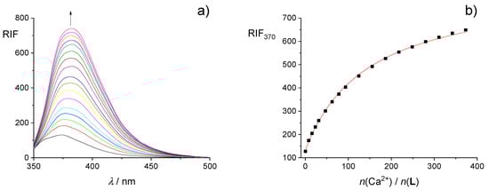 The results of spectrofluorimetric titration of L with Ca2+ are presented in Figure 3, whereas those corresponding to titrations with other cations are given in the Supporting Information (Figures S6–S9). As in the case of spectrophotometric titration curves, fluorimetric ones exhibited a linear dependence of relative fluorescence intensity (RIF) on the cation-to-ligand molar ratio for all cations with a clear break at ≈1:1 ratio, which suggested that the stability constants of all the corresponding complexes in acetonitrile should be exceptionally high. A large increase in the fluorescence of L upon cation complexation was observed, especially in the case of Ca2+ and Sr2+ (Figure 3 and Figure S8). That could be attributed to a significant suppression of photoinduced electron transfer (PET) upon complexation. Namely, in the case of free ligand, PET from the HOMO of the donor (oxygen atoms in the binding site) to the lower-energy orbital of the phenanthridine residue in the excited state might occur, leading to fluorescence quenching. On the other hand, upon cation binding, the energy of the donor HOMO becomes lower than that of phenanthridine, so PET and consequently quenching are inhibited, which in turn results in a fluorescence enhancement [55,57,63,64]. The differences in the emission properties of L and its complexes indicated its potential use as a fluorescent sensor for alkaline earth metal cations in acetonitrile, particularly for calcium and strontium ions.