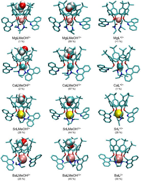 As in MeCN, the results of molecular dynamics simulations suggest that all cations are coordinated by all oxygen atoms in the calixarene binding site (Table S2). The solvent adducts with both orientations of the included methanol or ethanol molecule (alkyl group towards the cation, MLMeOH2+, MLEtOH2+; hydroxyl group towards the cation, MLMeOH’2+, MLEtOH’2+; Figure 10 and Figure S46) are the dominant forms of the complexes, although the species with “empty” basket (ML*2+) are also present in the case of larger cations. No coordination of Mg2+ by phenanthridine nitrogen atoms was observed (Tables S2 and S3), whereas unlike in MeCN, for larger cations the average number of coordinating phenanthridine N atoms in MeOH is almost independent of the cation radius, and in EtOH it peaks at Sr2+. This value is generally lower in MeOH than EtOH (Tables S2 and S3), suggesting that stronger coordination of metal cations by an oxygen atom of the included methanol molecule “pulls” the cation away from the phenanthridine subunits more strongly. A larger number of exchanged alcohol molecules in the calixarene basket compared to MeCN was observed (Tables S1–S3), indicating a lower extent of solvent inclusion in the former cases.