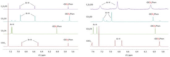 1H NMR spectra of L (left) and BaL2+ complex (right) in deuterated chloroform, acetonitrile, methanol, and ethanol at 25 °C.