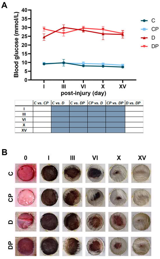 The study was approved by the Veterinary Administration, Ministry of Agriculture, Forestry and Water Management, Republic of Serbia (No. 323-07-04837/2021-05). Sixty male Wistar rats (200–250 g) were randomly assigned to four groups (n = 15 in each group): a control non-diabetic group (C), a PAW-treated control non-diabetic group (CP), a diabetic group (D), and a PAW-treated diabetic group (DP). Diabetes type 1 was induced by intraperitoneal injection of streptozotocin (Sigma, St. Louis, MO, USA) dissolved in citrate buffer (50 mg/kg) for five consecutive days while the control animals received citrate buffer. Two weeks after the streptozotocin injection, the blood glucose level was measured using a glucometer to confirm the establishment of diabetes. All animals were anesthetized by intravenous administration of Zoletil 100 (75 mg/kg) (Virbac, Suffolk, UK) and local subcutaneous administration of lidocaine hydrochloride (0.7%). Two full-thickness excisions were created on both sides of the posterior dorsal region with a 9 mm biopsy punch under sterilized conditions. Animals were caged individually, and, for the first five days, they received ketoprofen (5 mg/kg) (Kela, Hoogstraten, Belgium) for analgesia. From day 0, animals in the CP and DP groups received PAW treatment (300 µL − three applications from a spray bottle) twice a day at the same time during the whole experiment, while the C and D groups were treated with water. An equal number of animals (n = 3) were checked for blood glucose levels and euthanized on days I, III, VI, X and XV to perform further analyses.