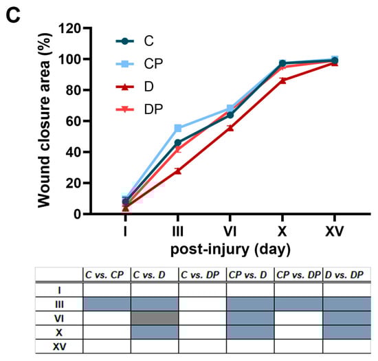 The effect of PAW treatment on the progression of wound healing in control and diabetic rats. (A) Blood glucose levels during the treatment period. (B) Representative photographs of the full-thickness skin wounds with or without PAW treatment in control and diabetic rats. (C) The wound closure area (%) during the healing process in control and diabetic rats with or without PAW treatment. C–Control non-diabetic group (n = 3); CP–PAW-treated control non-diabetic group (n = 3); D–diabetic group (n = 3); DP–PAW-treated diabetic group (n = 3). Values are expressed as means ± SEM, and the results of the ordinary two-way ANOVA and Tukey’s post hoc tests are presented in the tables below the graphs: dark grey p ≤ 0.01; blue p ≤ 0.001.