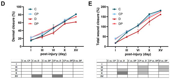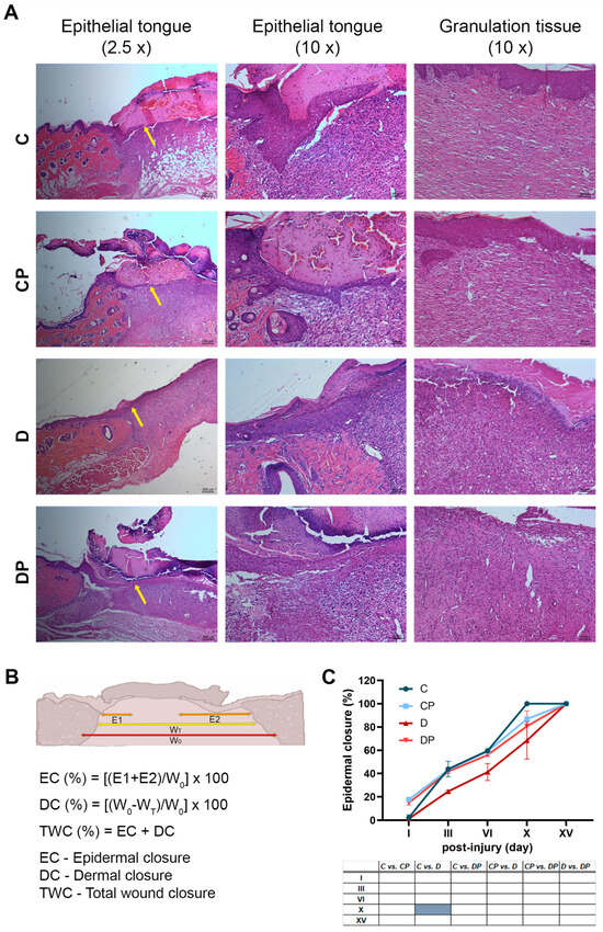 Histological evaluation of wound healing in control and diabetic rats with or without PAW treatment. (A) Haematoxylin–eosin staining of wounds with or without PAW treatment in control and diabetic rats. The progression of re-epithelialization at day VI is marked by yellow arrows (magnifications 2.5× and 10×), while the structure of granulation tissue is presented on day X after the injury (magnification 10×). (B) A schematic presentation of histologic measurements and formulas used for the calculation of epidermal closure (C), dermal closure (D) and total wound closure (E). C–Control non-diabetic group (n = 3); CP–PAW-treated control non-diabetic group (n = 3); D–diabetic group (n = 3); DP–PAW-treated diabetic group (n = 3). Values are expressed as means ± SEM, and the results of the ordinary two-way ANOVA and Tukey’s post hoc tests are presented in the tables below the graphs: light grey p ≤ 0.05; dark grey p ≤ 0.01; blue p ≤ 0.001.