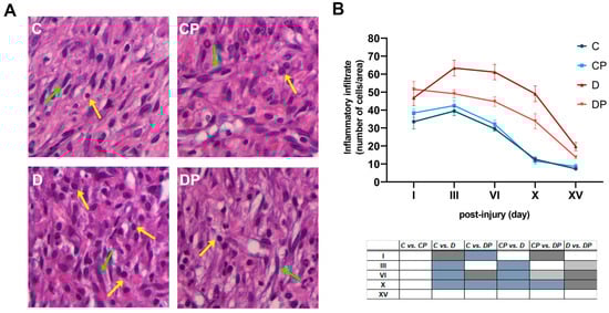 Comparable results were obtained after measuring complete wound closure on H&E-stained skin sections (Figure 2). As shown in the representative images, the results of H&E staining revealed a pronounced epithelial tongue spreading towards the wound surface in groups C, CP and DP (Figure 2A, yellow arrows), as well as the better maturation of granulation tissue in these groups. Quantification revealed that total wound closure was delayed in group D compared to all other groups on days III, VI and X (Figure 2E). In addition, a histologic analysis showed that the PAW-treated groups had better healing at the beginning of the healing process (day I) compared to the non-treated groups, as epidermal and dermal wound closure increased by 15.5% and 7.2%, respectively, in the CP group compared to the C group and by 13.5% and 5.7%, respectively, in the DP group compared to the D group (Figure 2C,D). This improvement in healing on day I could not be determined by simply photographing and measuring the wound closure area (Figure 1B,C). Histologic analysis also showed slightly better overall wound closure in the DP group compared to the D group on day XV post-injury (Figure 2D,E). This can be attributed to the 12.8% difference in dermal closure between these two groups, considering that the epidermis was completely closed in all groups on this day. It suggest that epidermal and dermal wound closure follow slightly different kinetics and that PAW treatment of diabetic animals improves the healing of cutaneous wounds, particularly affecting processes in granulation tissue.