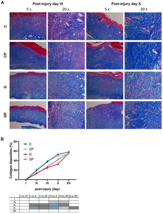 The effect of PAW treatment on collagen deposition during wound healing in control and diabetic rats. (A) Masson’s trichrome staining of wounds with or without PAW treatment in control and diabetic rats at days VI and X (magnifications 5× and 20×). (B) ImageJ software quantification of collagen (blue staining) expressed as % area within the sections. C–Control non-diabetic group (n = 3); CP–PAW-treated control non-diabetic group (n = 3); D–diabetic group (n = 3); DP–PAW-treated diabetic group (n = 3). Values are expressed as means of % area ± SEM, and the results of the ordinary two-way ANOVA and Tukey’s post hoc tests are presented in the tables below the graphs: light grey p ≤ 0.05; dark grey p ≤ 0.01; blue p ≤ 0.001.