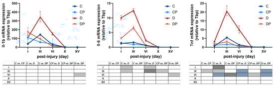 The first group of genes whose expression was analyzed involved genes that play a role in the inflammatory phase of wound healing (Figure 5). PAW treatment altered the kinetics of the Il-1β expression with the highest value on day I and induced a gradual decrease thereafter, while Il-1β expression reached its maximum on day III in both non-treated groups. The Il-1β mRNA level was the highest in the diabetic group on days III and VI, while PAW treatment decreased it to a control level and reached a significant difference between groups D and DP on day VI after injury. The level of Il-6 and Tnf mRNA was highest in the diabetic group, while the PAW treatment of diabetics significantly reduced the expression level of Il-6 on day VI and of Tnf on days III and VI. Genes that are mainly involved in the proliferative phase of wound healing were tested to investigate whether changes in their expression were responsible for the observed differences in collagen deposition. The mRNA expression level of Tgf-β1 remained elevated throughout the healing process, peaking on day III in the D group and on day VI in the other groups. From day III to X, PAW treatment decreased the expression of Tgf-β1 mRNA in the diabetic group to the control level compared to the untreated diabetic group. The mRNA expression level of alpha-SMA (Acta2), a marker of activated fibroblasts (myofibroblasts), was higher in the control groups compared to the diabetic groups, but no significant changes in expression were detected after PAW treatment. In addition, the mRNA expression of Col3-α1 and Col1-α1 was higher in the control groups than in the diabetic groups, with no difference in their expression being seen between the D and DP groups. The kinetics of the mRNA expression of two collagen genes revealed more prominent and prolonged expression of Col1-α1 mRNA after the fifteenth day, consistent with the switch from collagen III to collagen I in the later stages of wound healing.