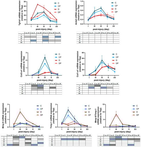 The effect of PAW treatment on the mRNA expression profile of selected genes in wound tissue from control and diabetic rats. C–Control non-diabetic group (n = 3); CP–PAW-treated control non-diabetic group (n = 3); D–diabetic group (n = 3); DP–PAW-treated diabetic group (n = 3). mRNA levels are presented relative to Tbp and are expressed as means ± SEM. The results of the ordinary two-way ANOVA and Tukey’s post hoc tests are presented in the tables below the graphs: light grey p ≤ 0.05; dark grey p ≤ 0.01; blue p ≤ 0.001.