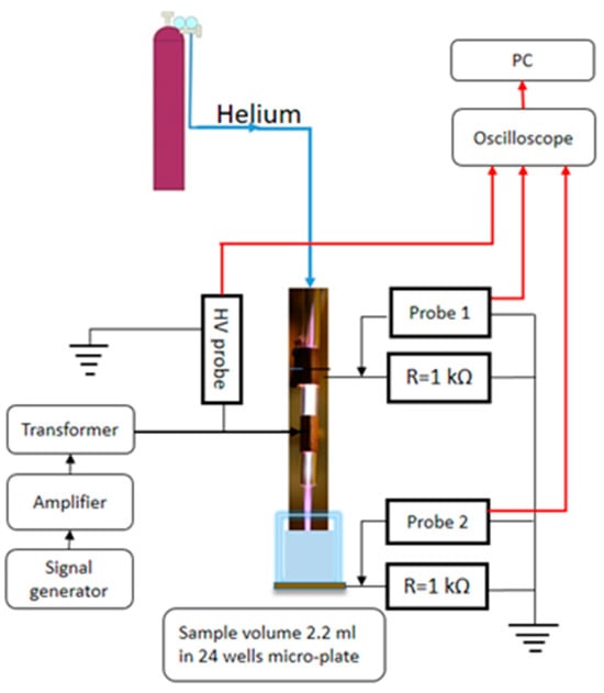 Figure 6 illustrates the Dielectric Barrier Discharge (DBD) type of atmospheric pressure plasma jet for treatments of distilled water. The DBD plasma jet consists of a glass tube with two 15 mm wide copper electrodes wrapped around the tube, and the gap between them is 5 mm. The electrode closer to the end of the tube was powered by a high-voltage sine wave at 80 kHz. The working gas was helium at 2 slm. The distance between the tube of the plasma jet and the surface of the sample was 5 mm. An amount of 2.2 mL of distilled water was treated in 24-well plates. The power transmitted to the plasma in contact with the sample was 0.5 W, and the treatment time was 10 min. After plasma treatment, colorimetric methods were used to determine the quantity of hydrogen peroxide (8 mg/L), nitrate (2 mg/L) and nitrite (0.2 mg/L). The concentrations of the measured RONS in PAW obtained in different treatments were highly reproducible. The pH of the PAW was not changed with respect to the distilled water (pH = 7).