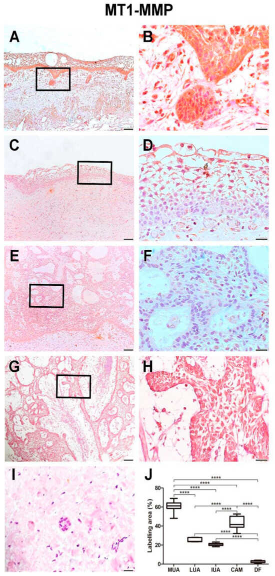MT1-MMP expression in MUA (A,B), LUA (C,D), IUA (E,F), CAM (G,H) and DF (I) groups. Magnification: 100 and 630×. Scale bars: 20 and 100 µm. Comparison of MT1-MMP immunoexpression between the samples of MUA, LUA, IUA, CAM and DF, **** p < 0.0001 (J).