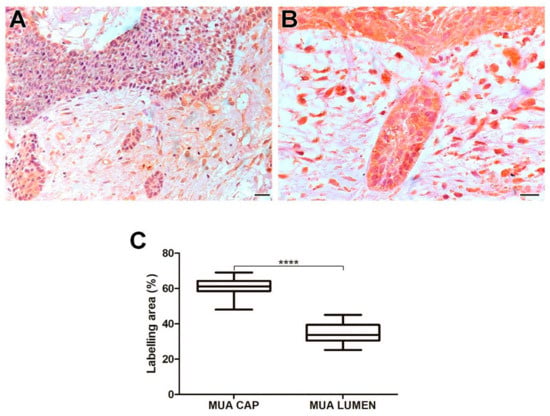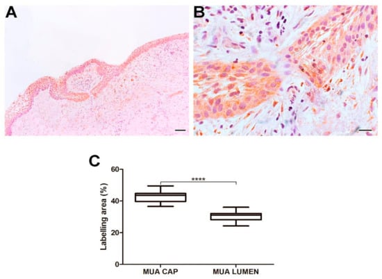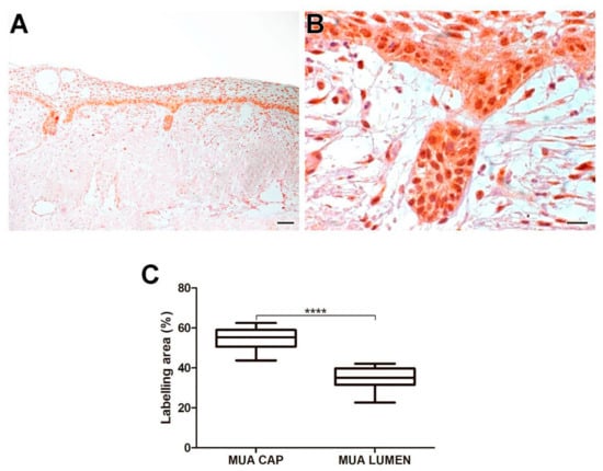 MT1-MMP expression in neoplastic MUA cells in the cystic capsule region and neoplastic MUA cells in the lumen region (A,B). Scale bars: 20 and 100 µm. Comparison of MT1-MMP immunoexpression between the capsule and lumen areas of MUA, **** p < 0.0001 (C).