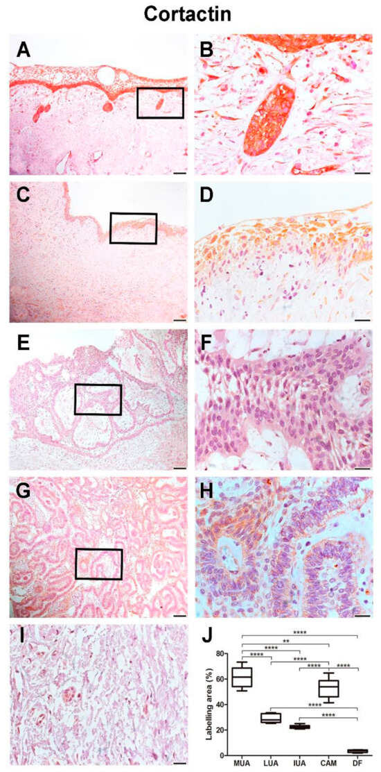 Cortactin expression in MUA (A,B), LUA (C,D), IUA (E,F), CAM (G,H) and DF (I) groups. Magnification: 100 and 630×. Scale bars: 20 and 100 µm. Comparison ofcortactin immunoexpression between the samples of MUA, LUA, IUA, CAM and DF, ** p < 0.01, **** p < 0.0001 (J).