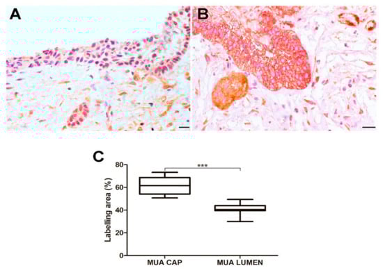 Cortactin expression in neoplastic MUA cells in the cystic capsule region and neoplastic MUA cells in the lumen region (A,B). Scale bars: 20 and 100 µm. Comparison of MT1-MMP immunoexpression between the capsule and lumen areas of MUA, *** p < 0.001 (C).