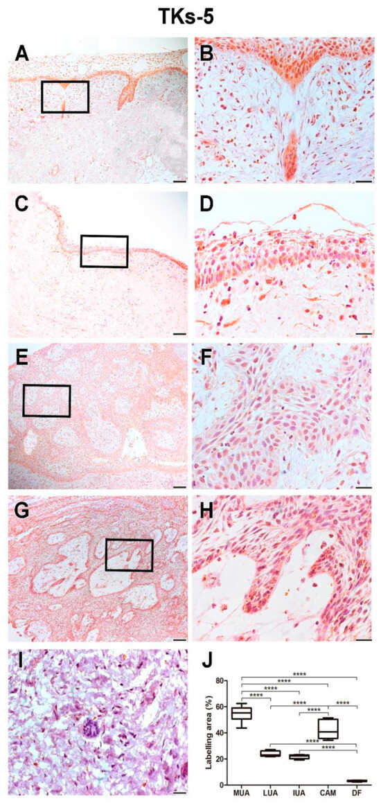 Tks-4 expression in MUA (A,B), LUA (C,D), IUA (E,F), CAM (G,H) and DF (I) groups. Magnification: 100 and 630×. Scale bars: 20 and 100 µm. Comparison ofcortactin immunoexpression between the samples of MUA, LUA, IUA, CAM and DF, **** p < 0.0001 (J).