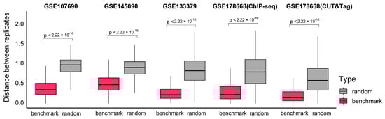 Evaluation of G4 benchmark datasets by signal distance between replicates. The x-axis represents different datasets and groups, and the y-axis represents distances between the signal vectors from two technical replicates within the same windows. Different groups, the benchmark and random, are indicated by different colors. Of the six test datasets utilized in this study, five containing technical replicates were selected for analysis, while GSE221437 was excluded from this evaluation due to the absence of replicate samples. Hypothesis testing between different groups was performed using the Wilcoxon test, and 2.22 × 10−16 is the default lower limit printed by the R package.