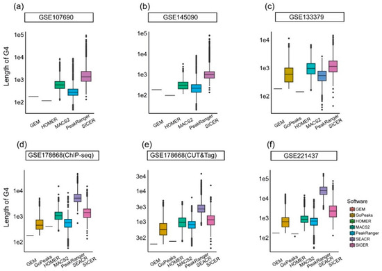 Logically, wider peaks will cover longer DNA regions, and thus have a higher probability of overlapping with pG4, oG4, or aG4 sites. The average widths of peaks identified by SEACR and SICER, across different test datasets, range from 3000 bp to 30,000 bp and from 1330 bp to 3870 bp, respectively (Figure 3). The low resolution of both algorithms partially accounts for the high proportions of overlapping peaks generated by them. In contrast, HOMER and GEM harvest peaks significantly narrower than those identified by other methods, with fixed values of 180 bp and 201 bp, respectively. This explains the low proportions of overlapping peaks produced by them. All four algorithms either generate wider peaks, which correspond to lower resolutions, or fail to produce a sufficient number of peaks that can be validated with G4 information available from other sources. This suggests that these algorithms may not be optimal choices for the peak calling processes of intracellular G4 sequencing data.