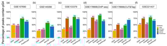 Proportion of pG4 sites in algorithm-specific G4 peaks from different test datasets. The x-axis represents different algorithms, and the y-axis indicates the percentage of overlapping pG4 sites. (a,b) use single-end test datasets, applicable to four algorithms to be run, while (c–f) employ test datasets that accommodate all five algorithms.