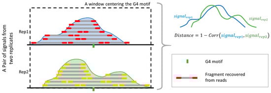 To validate the benchmark, a “distance” value was introduced to evaluate the consistency of G4 signals across replicates (Figure 7). Here, the peaks from the benchmark were attributed to the G4 motifs nearest to the peak center. The signal values with a 1000-bp window centering these motifs, from both replicates, were saved as vectors for calculating the distance values. The distance is defined as: