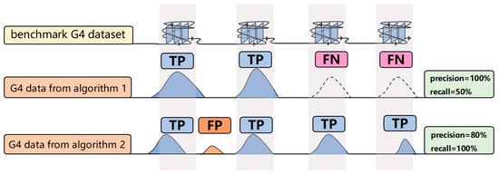 Precision and recall illustration. The first row shows the G4 benchmark dataset as the reference. The second and third rows depict G4 peaks identified by different algorithms. Blue peaks indicate true positives, orange peaks represent false positives, and dashed peaks denote false negatives.