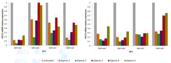 XYLT1 mRNA relative expression in MPS III (A–D) patients’ fibroblasts, after transfection with five different gapmer antisense oligonucleotides (100 nM). Expression levels were assessed at 24 and 48 h post-transfection. Data represent a single experiment per cell line (n = 1).