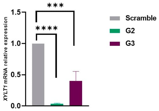 Following the selection of the most promising gapmer ASOs, transfection was repeated on fibroblasts from a MPS IIIC patient, and the effect on RNA levels was analyzed by qRT-PCR 24 h later. For this assay, a scramble gapmer was used as a negative control. Consistent with previous observations, cells transfected with G2 and G3 showed a significant inhibition of XYLT1 mRNA expression compared to cells treated with the scramble ASO. The inhibitory effect was more pronounced with G2 as expression levels around 10% (corresponding to 90% reduction) were observed. For fibroblasts treated with G3, a decrease of about 70% in XYLT1 mRNA expression was observed (Figure 2).