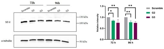 Before we addressed our ultimate goal, which was to check whether a decrease on HS was visible after treatment, we sought to clarify whether the decreases we had seen in XYLT1 expression levels did actually translate into a decrease in the levels of the protein it encodes, XT-I. XT-I quantification was conducted by comparing band intensities in cells transfected with gapmers G2 and G3 to those transfected with the scramble gapmer. At 72 and 96 h post-transfection, MPS IIIC fibroblasts showed a decrease in XT-I protein levels, as expected. This reduction is in alignment with the observed high inhibition of XYLT1 mRNA expression, indicating a corresponding decrease at the protein level. α-tubulin was used as control (Figure 3).