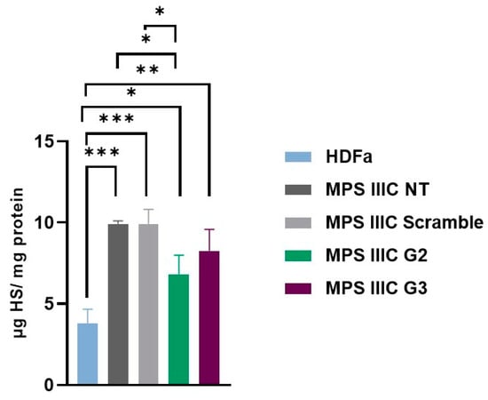 Quantification of heparan sulfate (HS). HS levels were measured in MPS IIIC patient’s fibroblasts 6 days post-transfection with gapmers (scramble, G2 and G3) and in the human dermal fibroblast (HDFa) cell line. Results are expressed in µg HS per mg protein. Statistical comparisons between groups were performed using one-way ANOVA and Tukey’s multiple comparisons test as a post hoc comparator (*** p < 0.001, ** p < 0.005, * p < 0.05). NT: non-transfected MPS IIIC fibroblasts.