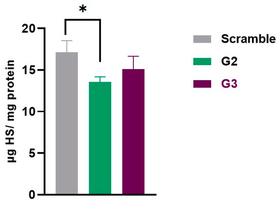 The results also showed that the gapmer G2 had a positive impact on HS storage, compared to the scramble gapmer (p < 0.05). Although not statistically significant, a decreasing trend is observed when comparing the HS levels of the samples treated with the scramble ASO with the cells transfected with the gapmer G3 (Figure 4).