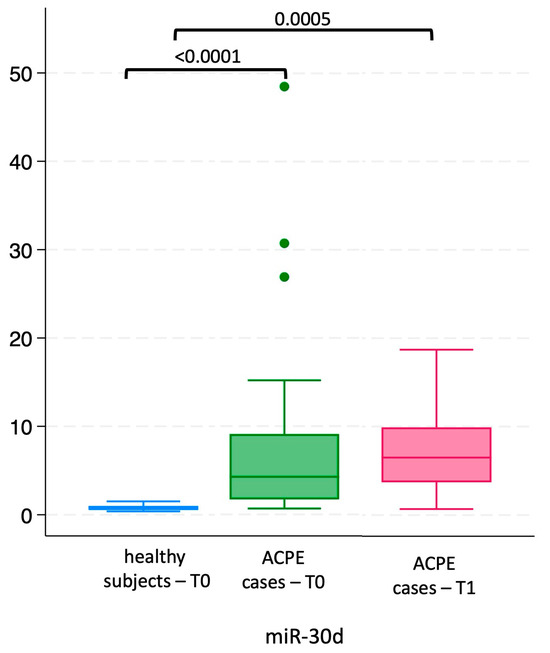 Plasma levels of circulating miR-30d were significantly higher in ACPE patients compared to healthy controls, both at enrollment (T0, p < 0.01) and at the one-month follow-up (T1, p = 0.0005; see Figure 1).