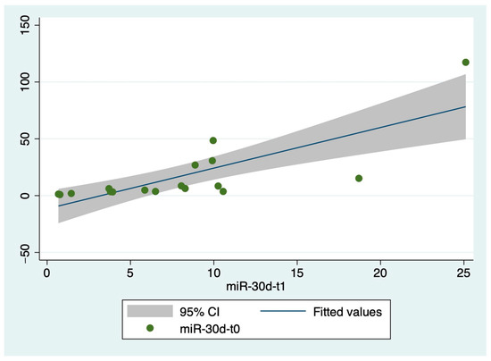 Correlation between circulating levels of miR-30d at T0 and T1.