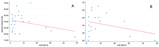 Correlation between the circulating levels of miR-30d at T0 and the ejection fraction at arrival in the ED (panel (A)) and at one-year follow up (panel (B)) in enrolled ACPE patients.