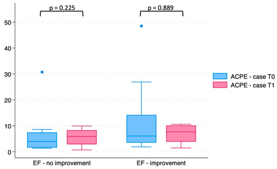 The median value of the ejection fraction slightly increased in those 18 ACPE patients alive after one-year follow-up (42.5%, range 20–65%; p = 0.018 for difference in comparison with the EF at enrollment time—Figure 4).