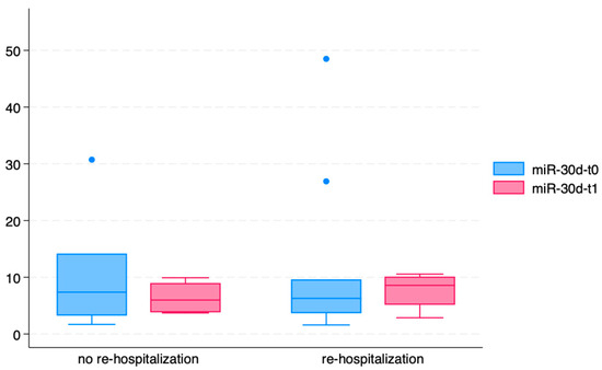 Circulating levels of miR-30d at T0 and T1 in ACPE patients stratified based on the occurrence of re-hospitalization during the one-year follow-up.