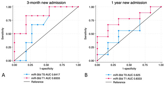 ROC curves for the accuracy of miR-30d levels measured at T0 and T1 for the occurrence of re-hospitalization at 3 months (A) and at 1 year (B) from the enrollment.