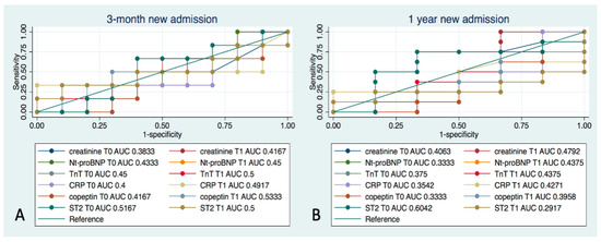 ROC curves for the accuracy of all biomarkers examined (i.e., creatinine, troponin T, NT-proBNP, CRP, copeptin, and ST2) measured at T0 and T1 for the occurrence of re-hospitalization at 3 months (A) and at 1 year (B) from enrollment.
