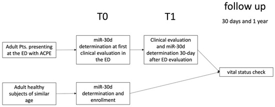 The purpose of our study was to evaluate the circulating levels of miR-30d in patients who presented to the ED with ACPE. These patients were evaluated at the time of ED presentation (identified as T0), and at one-month follow-up (T1), and miR-30d expression levels were compared with those of healthy subjects.