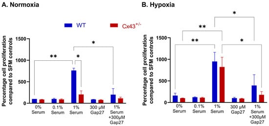 Effects of Cx43 on proliferation responses of MPAFs from WT and Cx43+/− mice to serum under (A) normoxic and (B) hypoxic conditions (24 h). MPAFs from Cx43+/− mice showed increased proliferation with 1% serum only under hypoxic conditions. However, treatment with 37,43Gap27 reduced 1% serum-induced proliferation in both normoxic and hypoxic conditions in WT MPAFs and under hypoxic conditions in Cx43+/− MPAFs. Neither WT nor Cx43+/− MPAFs exhibited proliferation in response to 0.1% serum in both normoxic and hypoxic conditions. Data are shown as mean ± S.E.M., and analysis was carried out by two-way ANOVA with a Tukey post hoc test. * p < 0.05, ** p < 0.01, n = 3.