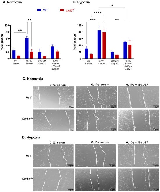 Effects of Cx43 on migration responses of MPAFs from WT and Cx43+/− mice to serum under normoxic (A,C) and hypoxic (B,D) conditions (24 h). Under hypoxic conditions, MPAFs from Cx43+/− mice showed increased migration with 0.1% serum, which was reduced by 37,43Gap27 in both WT and Cx43+/− MPAFs. In normoxia, WT MPAFs exhibited a higher migratory response to 0.1% serum compared to Cx43+/− MPAFs. The images in C and D depict the gap closure in scratch assays, indicative of cell migration. Data are shown as mean ± S.E.M., and analysis was carried out by two-way ANOVA with a Tukey post hoc test. * p < 0.05, ** p < 0.01, *** p < 0.001, **** p < 0.0001, n = 3.