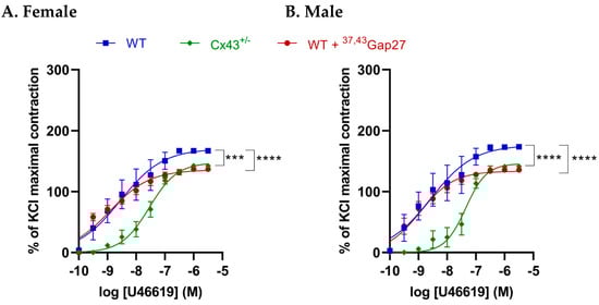 The contractile response to U46619 in IPAs of (A) female and (B) male mice. Both the maximum contraction (Emax) and the logarithm of half-maximal effective concentration (LogEC50) to U46619 were significantly reduced in Cx43+/− mice compared to WT mice. Additionally, the Cx43 blocker 37,43Gap27 markedly decreased U46619 responses in WT mice. No significant differences between sexes were found in either LogEC50 or Emax. *** p < 0.001, **** p < 0.0001 compared to WT controls within same experimental group, n = 6 per group. Data are shown as mean ± S.E.M.