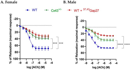 Endothelium-dependent relaxation to ACh in IPAs of (A) female and (B) male mice. A noticeable decrease in maximal relaxation responses in Cx43+/− mice compared to wild-type controls across both sexes was observed. In addition, pre-incubation with the gap junction blocker 37,43Gap27 led to a reduction in ACh-induced relaxation in WT mice. However, no significant differences between sexes were found in either LogEC50 or Rmax. *** p < 0.001, **** p < 0.0001 compared to WT controls within same experimental group, n = 6 per group. Data are shown as mean ± S.E.M.