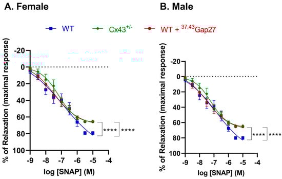 Relaxation produced by SNAP in IPAs of (A) female and (B) male mice. Reduced maximal relaxation (Rmax) was seen in female and male Cx43+/− mice compared to WT controls. Pre-treatment with 37,43Gap27 also diminished relaxation responses in WT mice. However, no significant differences between sexes were found in either LogEC50 or Rmax. **** p < 0.0001 compared to WT controls within same experimental group, n = 6 per group. Data are shown as mean ± S.E.M.