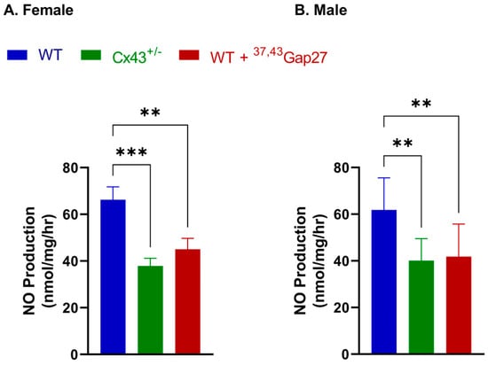 NO production by IPAs in whole left lung lobes. Panels (A,B) show NO production in female and male mice, respectively, revealing significant reductions between WT and Cx43+/− mice. Addition of a Cx43 blocking peptide also significantly reduced NO production in both female and male WT left lung lobes. ** p < 0.01, *** p < 0.001 compared to WT within same experimental group. Data represent mean ± S.E.M. NO production was analyzed by two-way ANOVA with Tukey post hoc test, n = 7 per group.