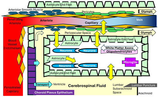 Generation of cerebrospinal fluid. Plasma flux through the blood–brain parenchyma and blood–choroid plexus barriers, brain metabolism, and the exchange of solutes between brain interstitial fluid and cerebrospinal fluid determine the composition of cerebrospinal fluid. It is presumed that metabolic effects in brain cells can be inferred from the constituents in cerebrospinal fluid. Cerebrospinal fluid (light yellow) is synthesized by tightly controlled transport processes via choroid plexus epithelial cells. Cerebrospinal fluid fills the ventricular system and perivascular spaces. Plasma is separated from brain parenchyma by endothelial cells (orange), pericytes (green), arteriolar smooth muscle (dark blue), cerebrospinal fluid (light yellow) in the perivascular space, and astrocytic end feet processes (light green). Metabolites and lipids diffuse between astrocytes, neurons (light blue), microglia (magenta), oligodendrocytes (pink), and myelin in white matter (white). Brain interstitial fluid (black) exchanges metabolites between cells and fluid spaces and is reabsorbed into the venous system via glymphatic channels while cerebrospinal fluid is reabsorbed by arachnoid granulations. There is no guarantee that lumbar puncture can sample all of these compartments and nutrient exchanges.