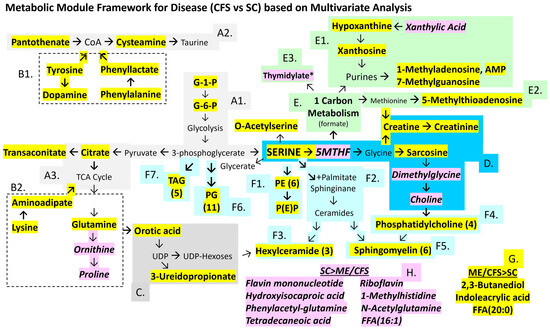 Metabolic modules and imbalances in non-exercise ME/CFS. The map provides an overview of cerebrospinal fluid metabolic pathways that differed between ME/CFS and SC at baseline and were influenced by exercise in multivariate analysis. Metabolic pathways are summarized (indicated by arrows connecting strings of intermediate compounds) and organized into color-coded modules. Metabolites that were significantly elevated in ME/CFS (ME/CFS > SC) are in bold with yellow highlighting while the converse (SC > ME/CFS) are in italics with pink highlighting. Central energy metabolism is shown in grey with A1. glycolysis, A2. coenzyme A (CoA) metabolism, and A3. TCA (tricarboxylic acid) cycle. Amino acid metabolism (beige) has two components: B1. essential aromatic amino acid metabolism that leads to acetylCoA and B2. (boxes with dashed lines) anaplerotic amino acid metabolism related to the TCA cycle. Glutamine plays a central role in these pathways and C. pyrimidine metabolism (dark grey). A novel finding was the persistent finding of serine (bold, upper case, yellow highlighting) in ME/CFS and the number of metabolites in the D. serine/glycine/5-methyltetrahydrofolate (5MTHF)/one-carbon pathways (dark blue). E. Methyl transfer (green) is essential for E1. purine synthesis, E2. methionine pathway, and E3. thymidylate synthesis. Serine provides a direct link to phospholipid synthesis (F., blue) as a source material for phosphatidylethanolamine (PE) and phosphatidylethanolamine plasmalogens (P(E)P) (F1). F2. Serine and palmitate combine to form sphinginane, which is the precursor of ceramides. F3. UDP-hexoses are attached to form hexylceramides. F4. Glycine is metabolized by N-methylation to form sarcosine, dimethylglycine, and choline (trimethylglycine) for synthesis of phosphatidylcholines (PCs). F5. Phosphatidylcholines exchange headgroups with ceramides to form sphingomyelins (SMs). F6. 3-Phosphoglycerate and dihydroxyacetone phosphate are source materials for the formation of phosphatidylglycerols (PGs) and F7. triacylglycercides (TAGs). Numbers in parentheses after lipids indicate the number that were significantly altered (p < 0.05, Sidak correction for multiple comparisons). Metabolites with other physiologies or microbial origins are tabulated for ME/CFS > SC (G., yellow) and SC > ME/CFS (H., pink). Other abbreviations: G-1-P: glucose-1-phosphate; G-6-P: glucose-6-phosphate; AMP: adenosine monophosphate. Nonsignificant intermediates are in smaller font (not bold). * Thymidylate is a special case because different derivatives from the mass spectrometry analysis were altered in different directions.