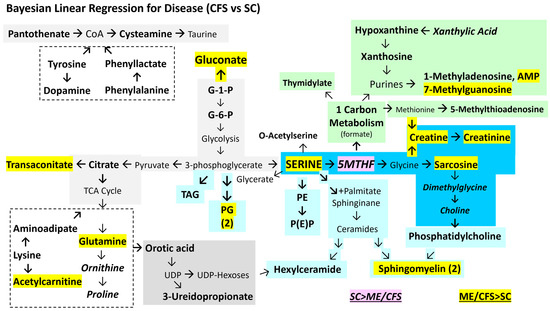 Serine was identified as a novel central hub in cerebrospinal fluid metabolism in ME/CFS. Serine links glycolysis to glycine, one-carbon metabolism via 5-methyltetrahydrofolate (5MTHF), and phospholipid synthesis [75,76,77]. The inverse relationship between serine and 5MTHF indicated disruption of methylation, which was supported by the elevation in sarcosine (methylglycine), creatine, and creatinine and reduction in dimethylglycine and choline. Other metabolites affected by methylation were altered. 5-Methylthioadenosine, an intermediate in the methionine pathway, was elevated in ME/CFS. Purine and thymidylate synthesis and degradation were disrupted, which may be due to folate consumption or insufficiency. 1-Methyladenosine and 7-methylguanosine may be derived from epigenetic methylation of DNA and RNA followed by polymer digestion.